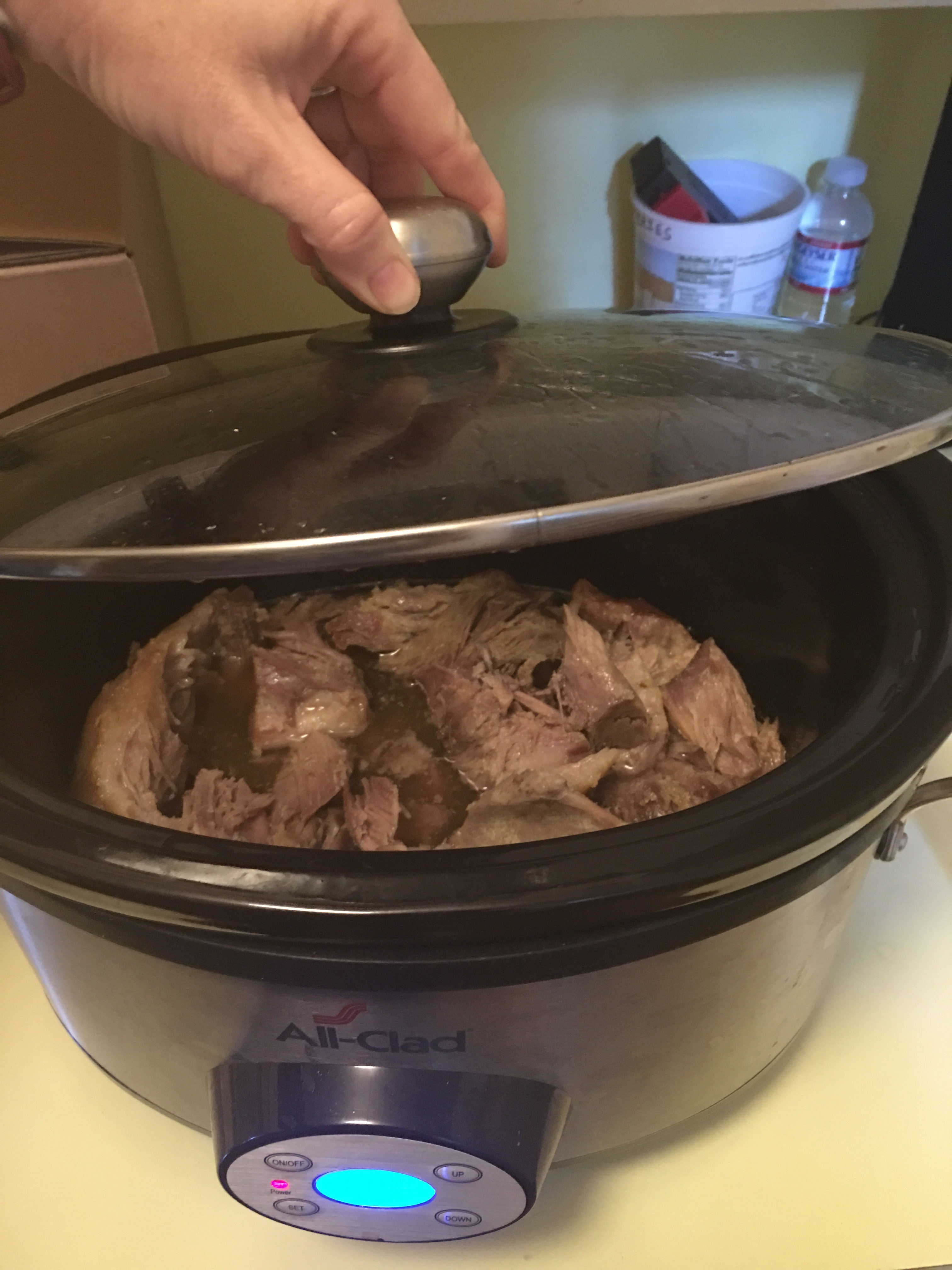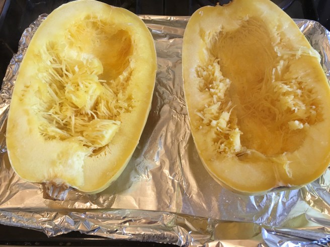Place on a rimmed baking sheet, cut side down, in 1/2″ water. Place in a 400 degree oven for 25-30 minutes depending on how big your squash is. Over-cooked spaghetti squash is icky, so test your squash after 20-25 minutes. If it shreds easily into spaghetti, it is ready! I shred it all and put it into containers in the fridge.