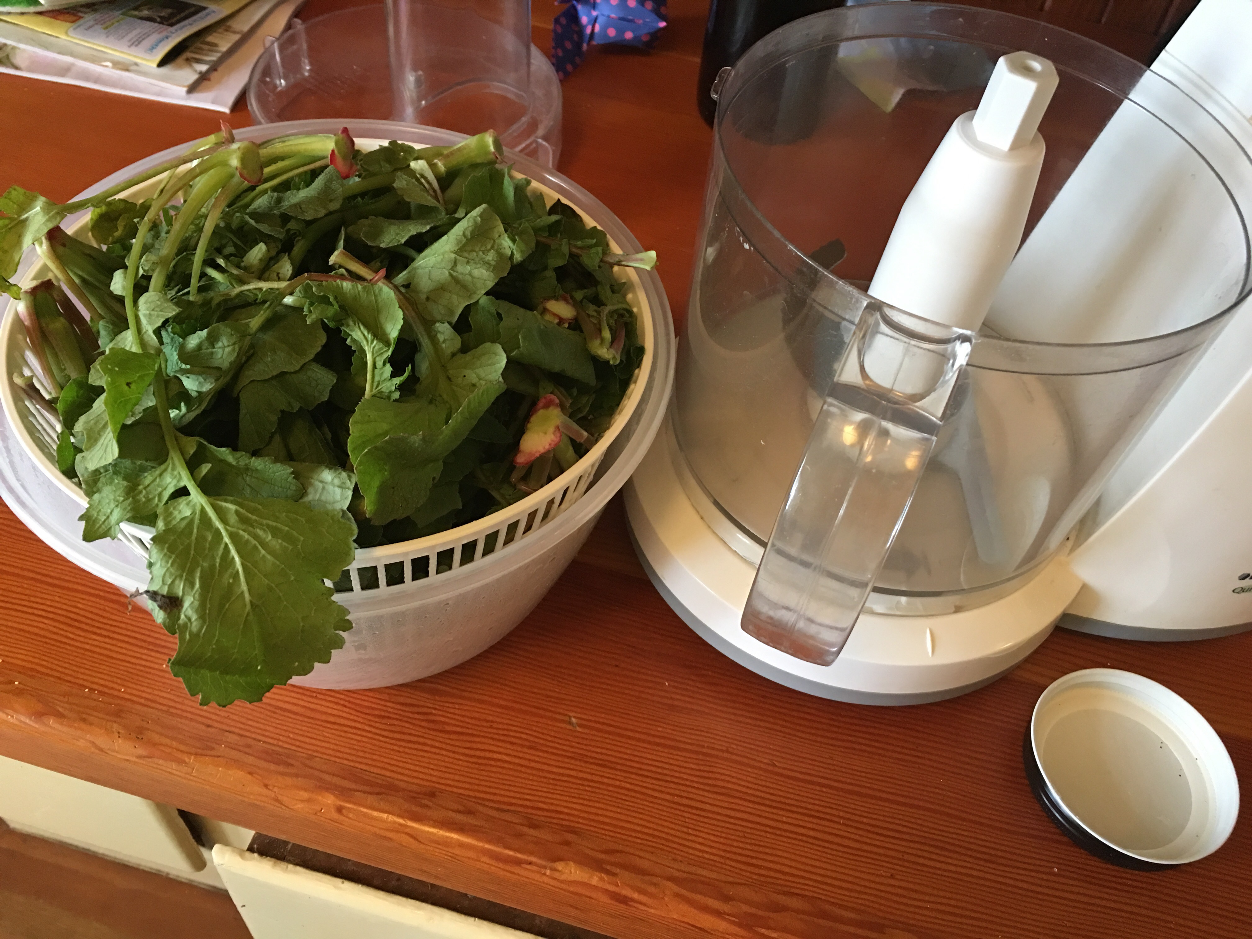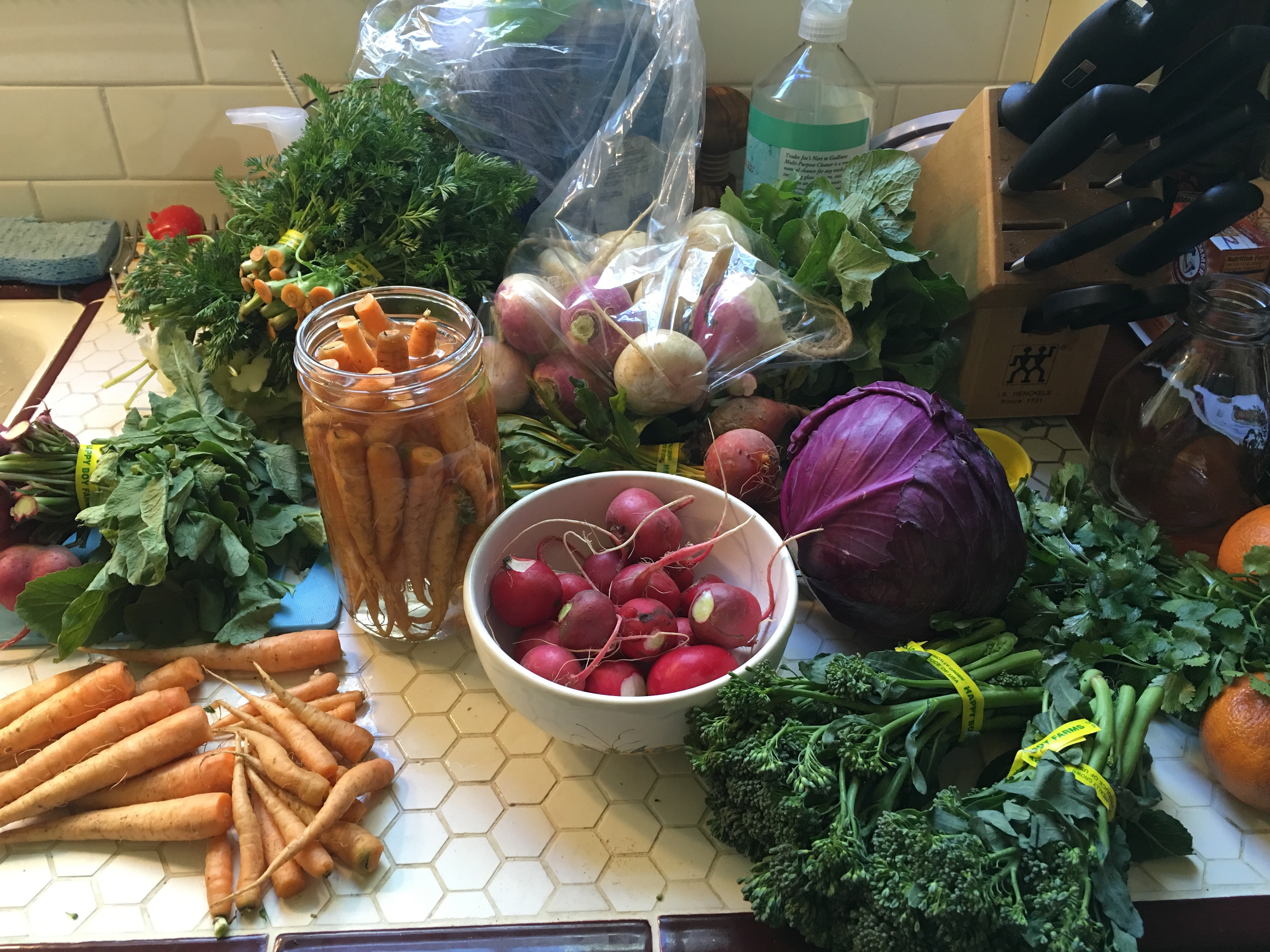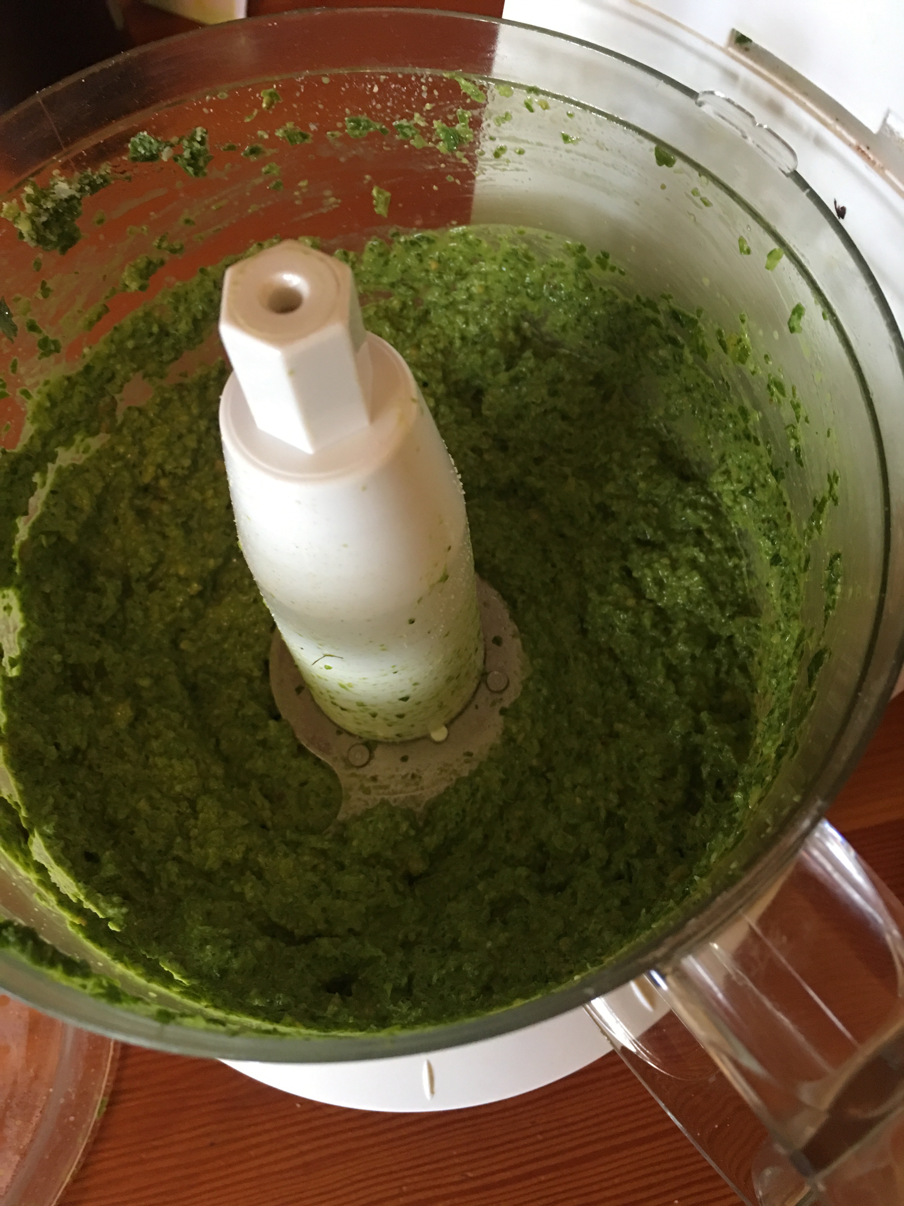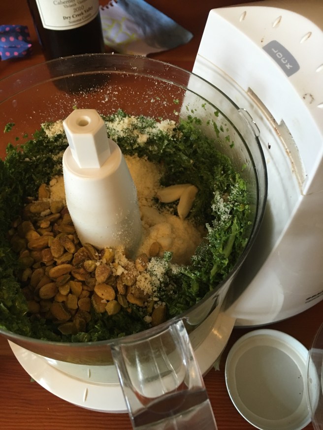 I roasted a pan of turnips, and steamed and sautéed a few bunches of broccolini with oil and garlic. In addition, I used the tops of radishes from the farmer’s market to make radish & pistachio pesto, which makes a great dip, sauce, or spread.