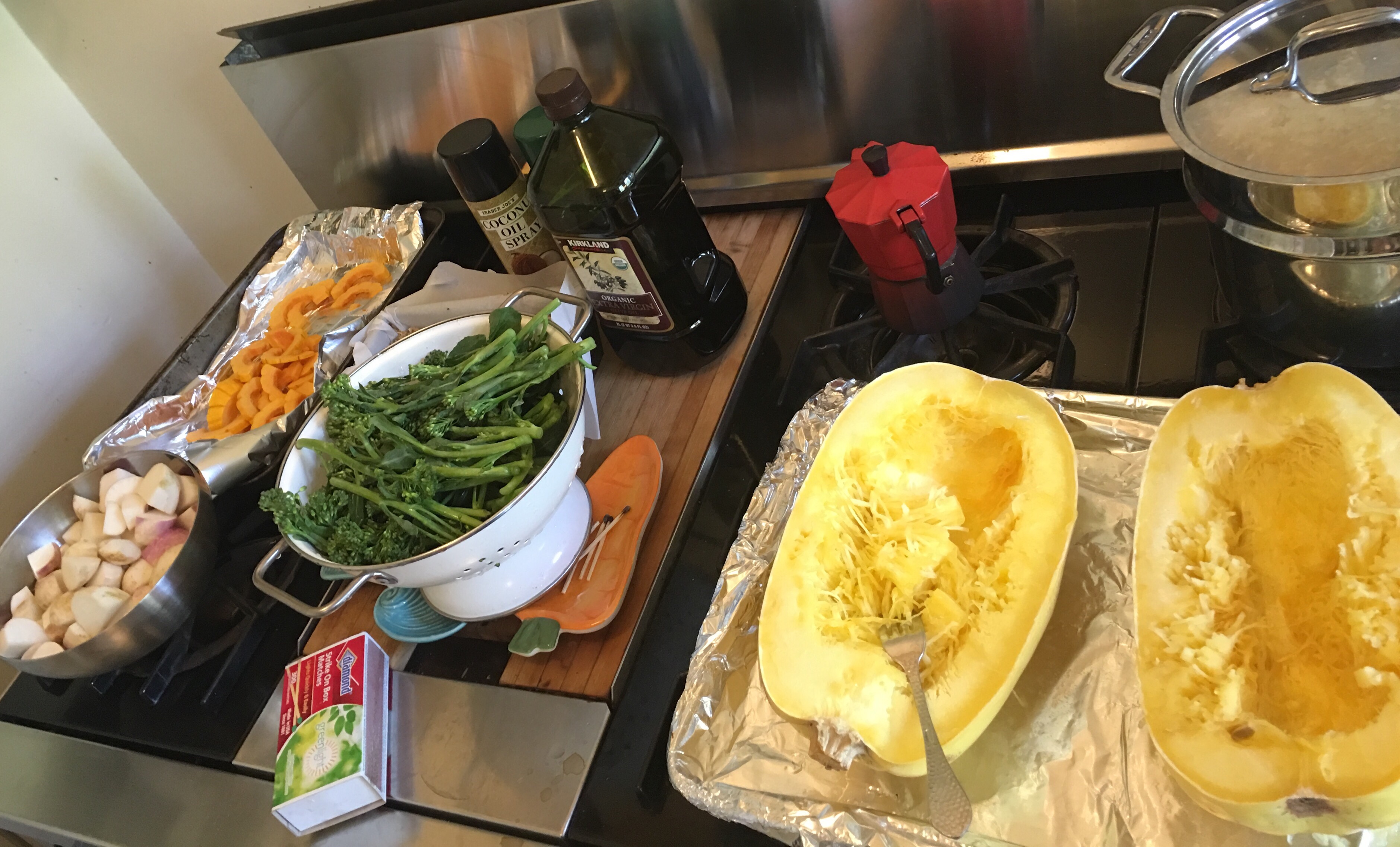 The first step of eating mindfully for me is preparing elements of meals in advance so they can just be thrown together easily(I had a hard boiled egg over microwaved broccolini for breakfast today). This week I cooked a gigantic spaghetti squash, as it is a great non-grain base for bowls of protein, sautéed greens, and healthy sauces.