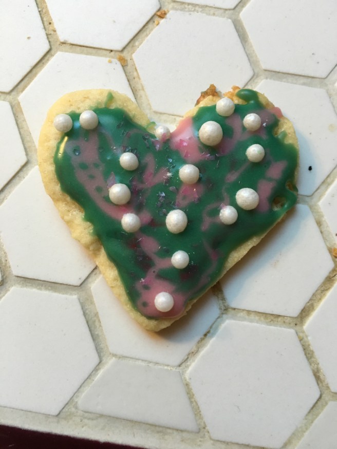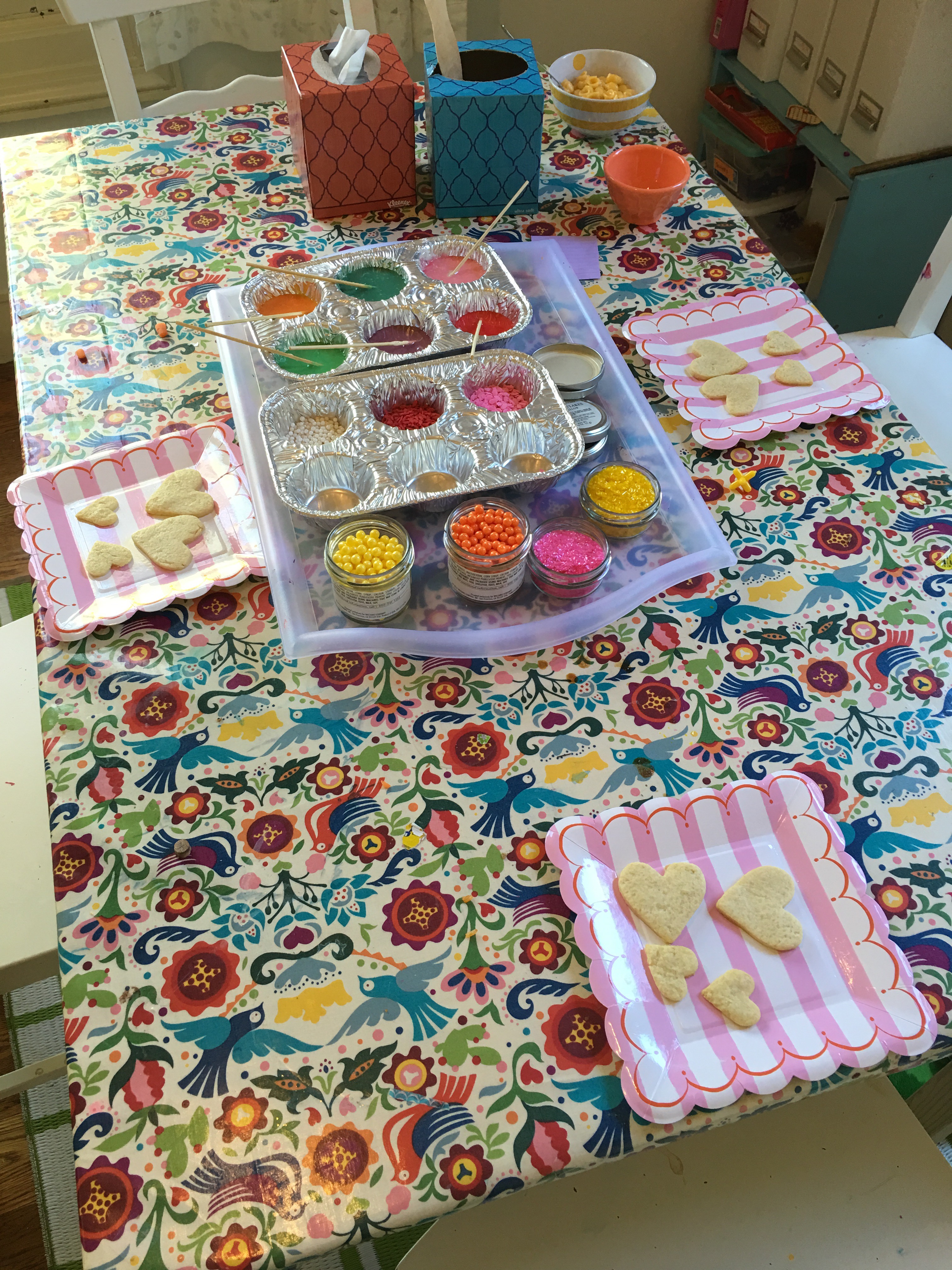 I also adore his friends’ mothers, so it is a big win for me too. Usually we just let the little fellows wreak havoc while we chat, but today we set up an activity in honor of Valentine’s Day- decorating sugar cookies!