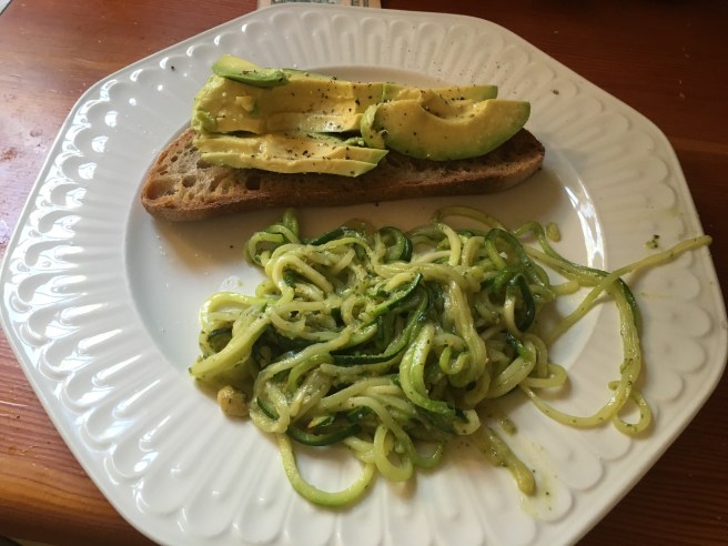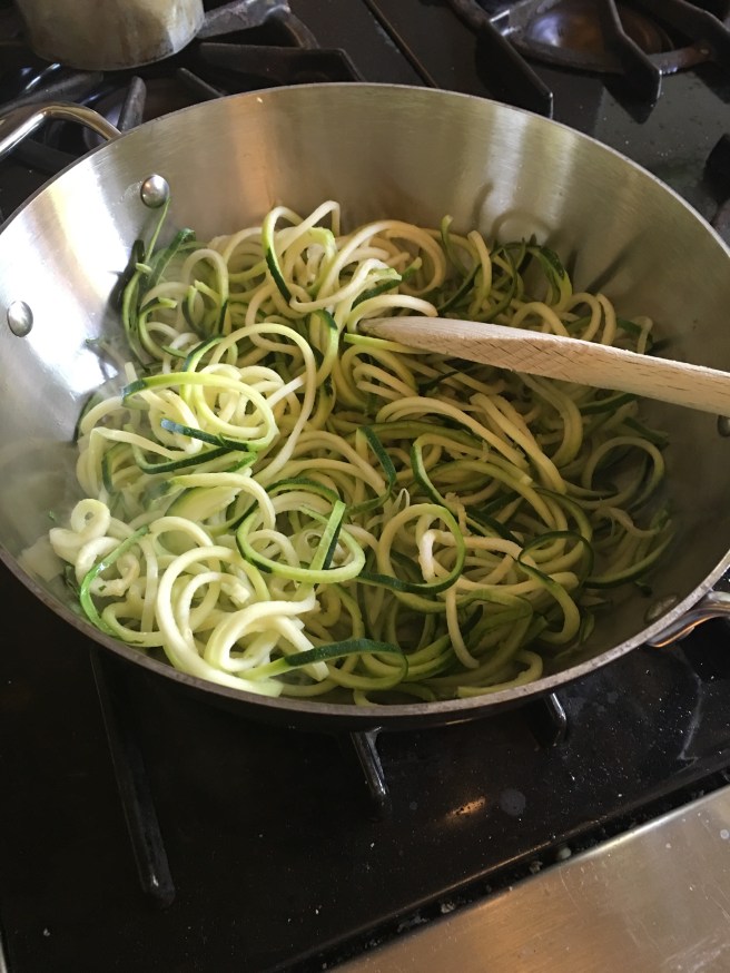 I love a good food trend. Chipotle chiles in adobo? Thank you, Martha. Zatar? Sumac? Oh Yotam. So of course I was intrigued the spiralizer madness going on in my Pinterest and Instagram feeds this fall. I got a complicated Austrian one I’m too afraid to remove from the box, then on a whim ordered this super simple oxo one. I LOVE it! Of course I’ve only spiralized zucchini so far but the noodles it makes are super thrilling and more fun and tasty to eat than most pasta(which, let’s face it, is usually just a bland vehicle for rich sauce anyway). My adventuresome eater loves it too- she slurped up a bowl of zoodles sautéed with homemade radish leaf and pistachio pesto I had intended for her father.