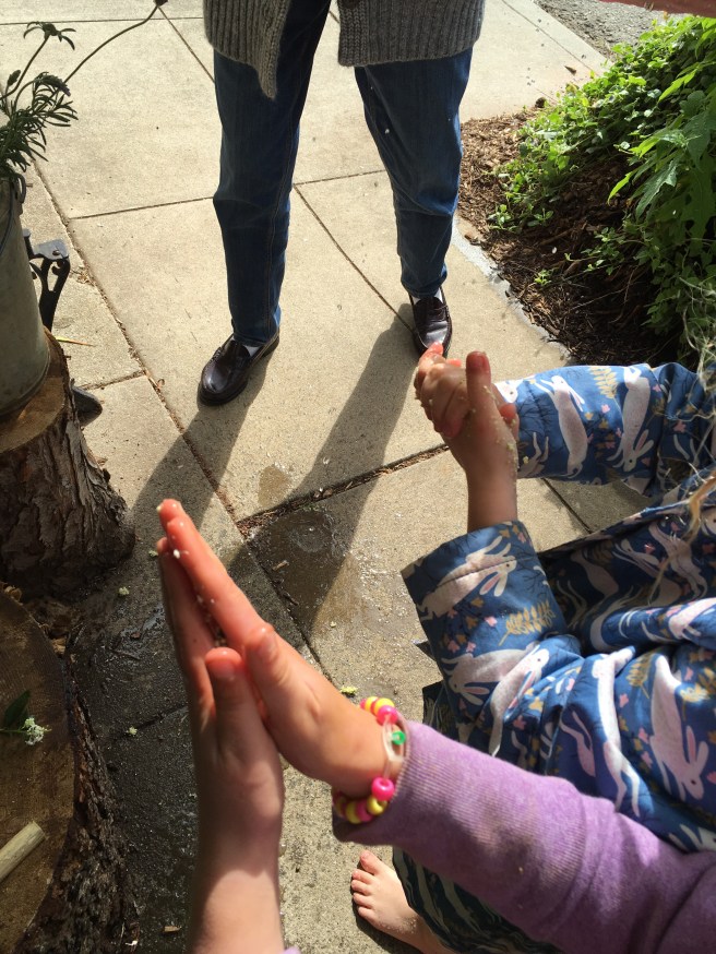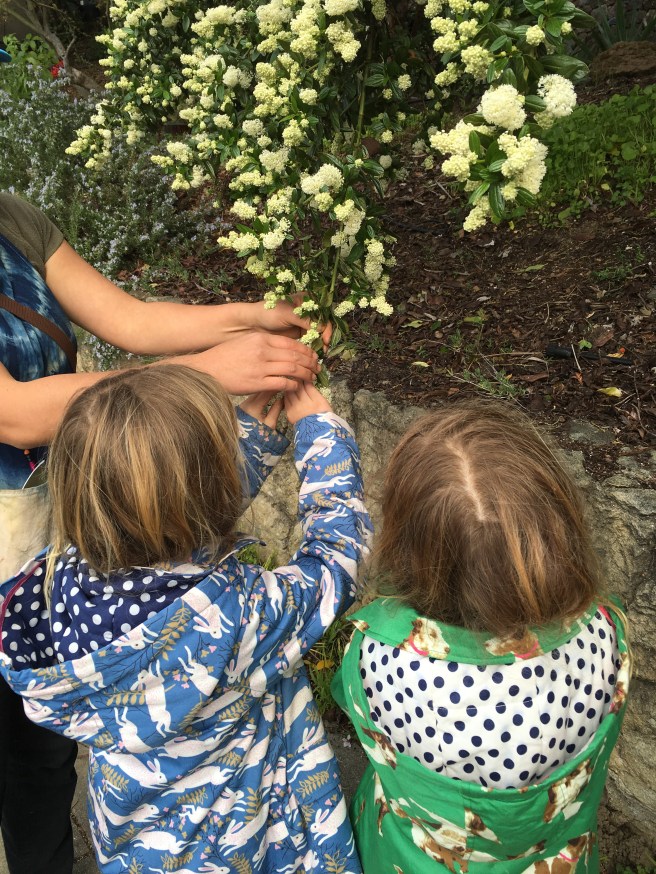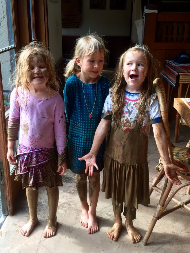 Around the corner from the magical preschool my son attends, and my older daughters graduated from, there is a hillside permaculture paradise. At this Hillside Homestead, their former garden teacher Allison provides amazing small group garden sessions, full of mud and digging and picking and eating and making natural dyes and feeding goats and other wonders I couldn’t have imagined growing up as a city child. My son goes twice a week after school, and my daughters had a chance to spend the morning there with a friend who also has the week off. They made the very most of it! Allison is wonderful about sharing photos and videos of their adventures, the first photo is hers: