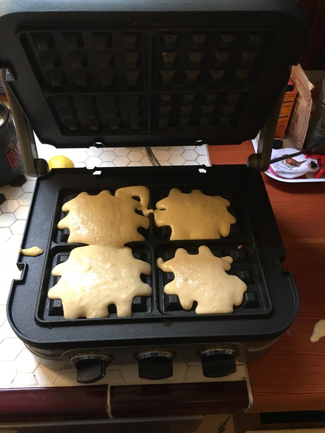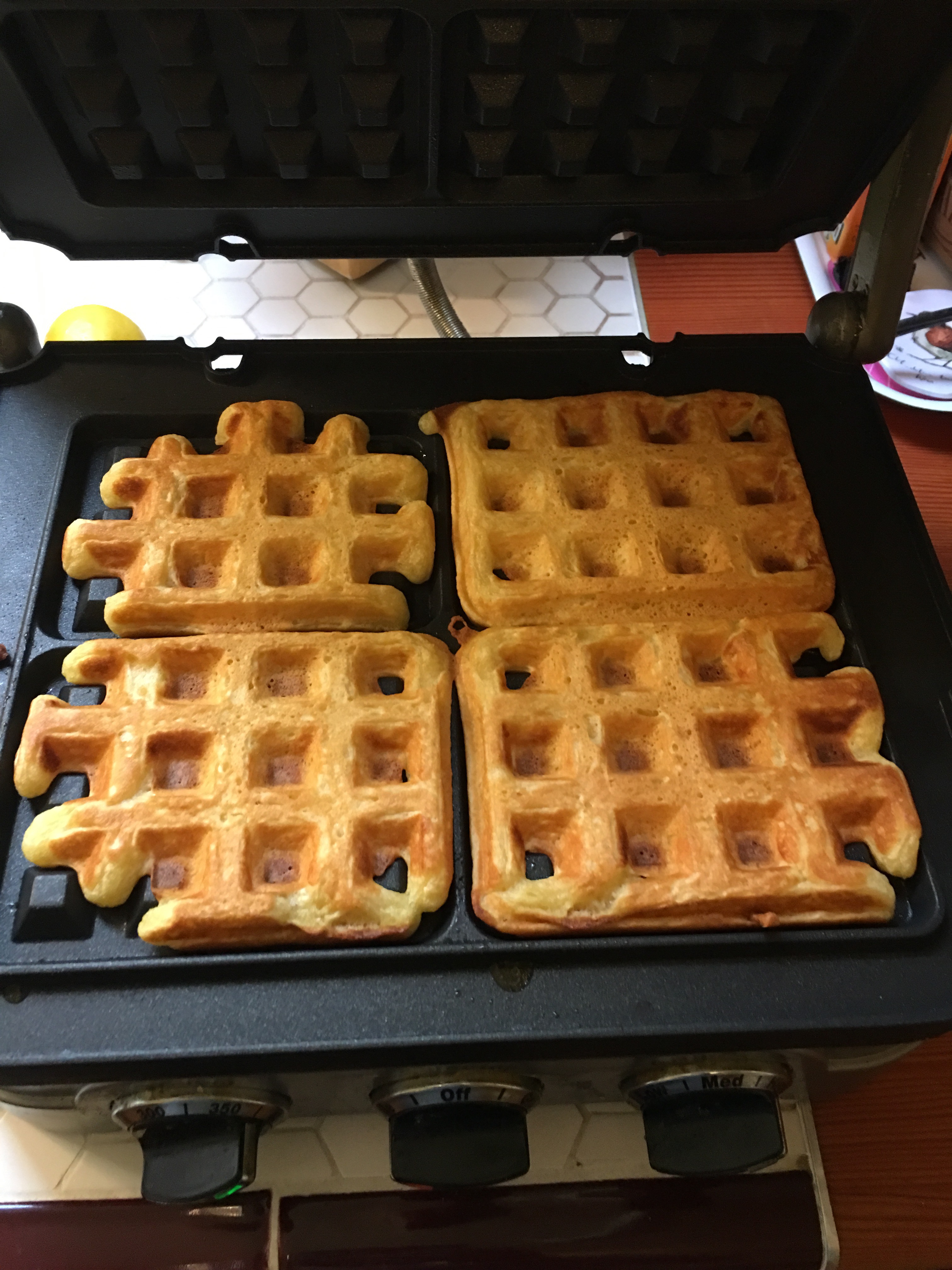 I love to cook and bake, but I also like to do other stuff(like knit and sleep), so when I make something that takes a bit of effort and mess, I like it to last for more than one meal. Waffles are a case in point: always delicious, always a hit, but a bit more time consuming than buttered toast. Enter my favorite kitchen tool the Cuisinart Griddler which makes the best grilled steak and chicken tenders indoors, and with the optional waffle plates makes  multiple waffles at once a snap. I use Martha’s recipe and add a scoop or two of vanilla whey protein powder to give them a bit more nutritional oomph