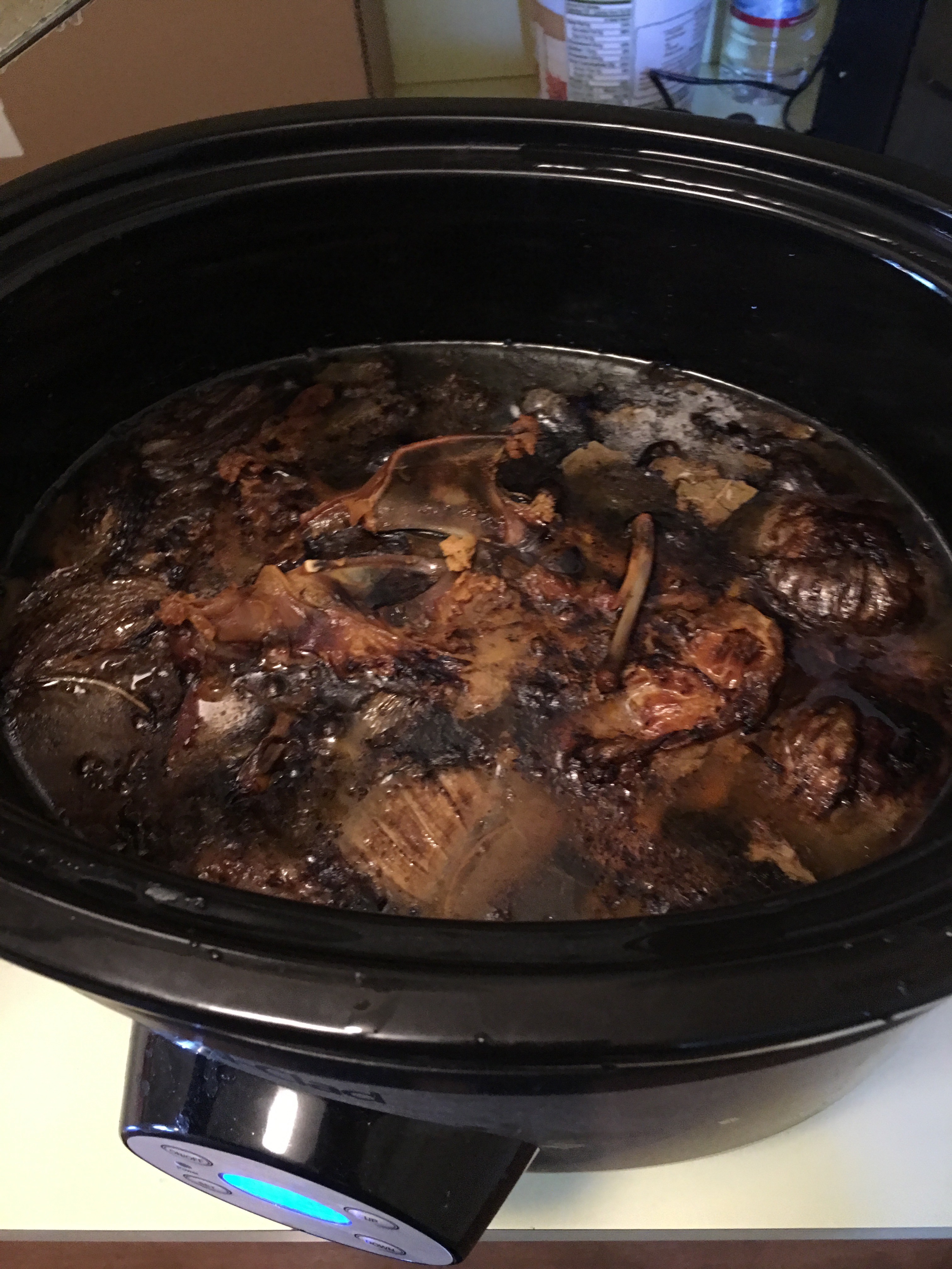 Chuck it all into your slow cooker and set to low for 20 hours. If you think of it, you can cruise by after 8-10 hours and use a potato masher to smush the bones and release extra gelatinous goodness, then cover and keep cooking. When you are done it will be all gorgeous and a golden caramel color