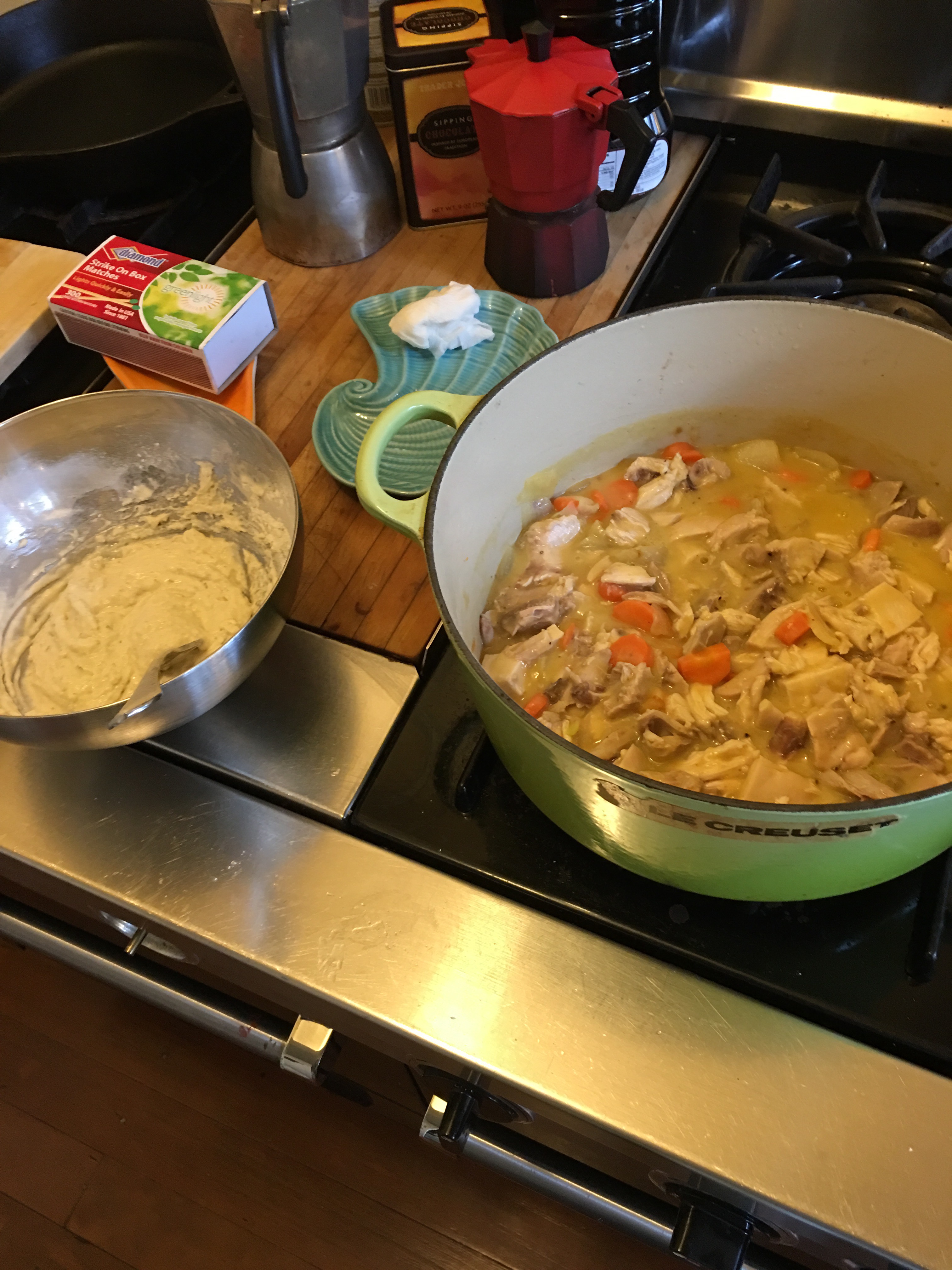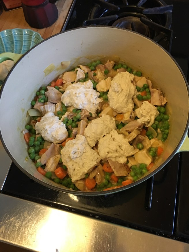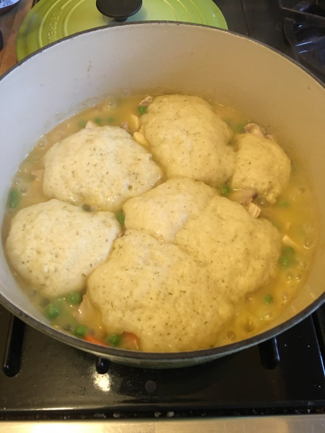 Drop your blobs of dumpling dough on the simmering chicken and vegetables and cover: