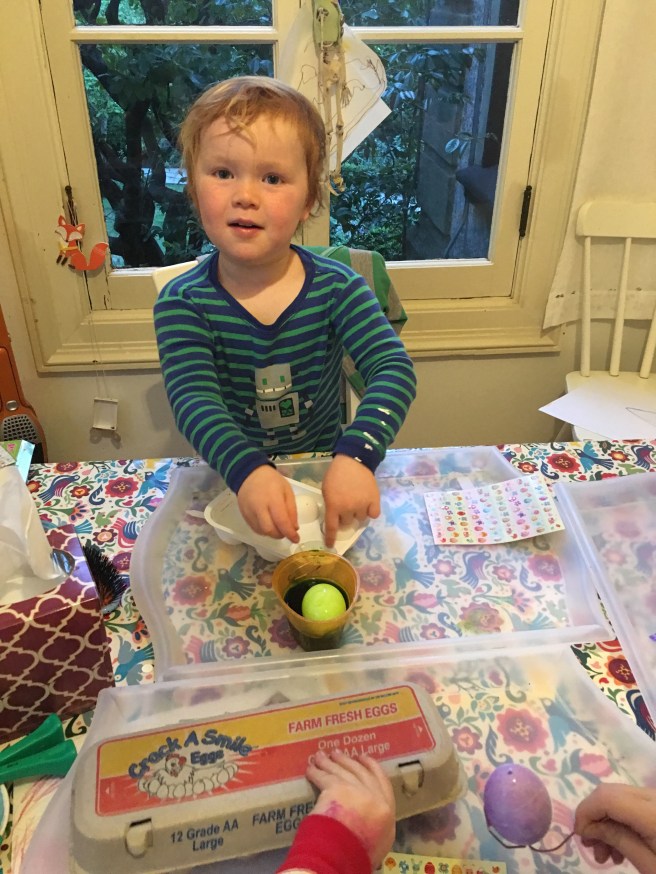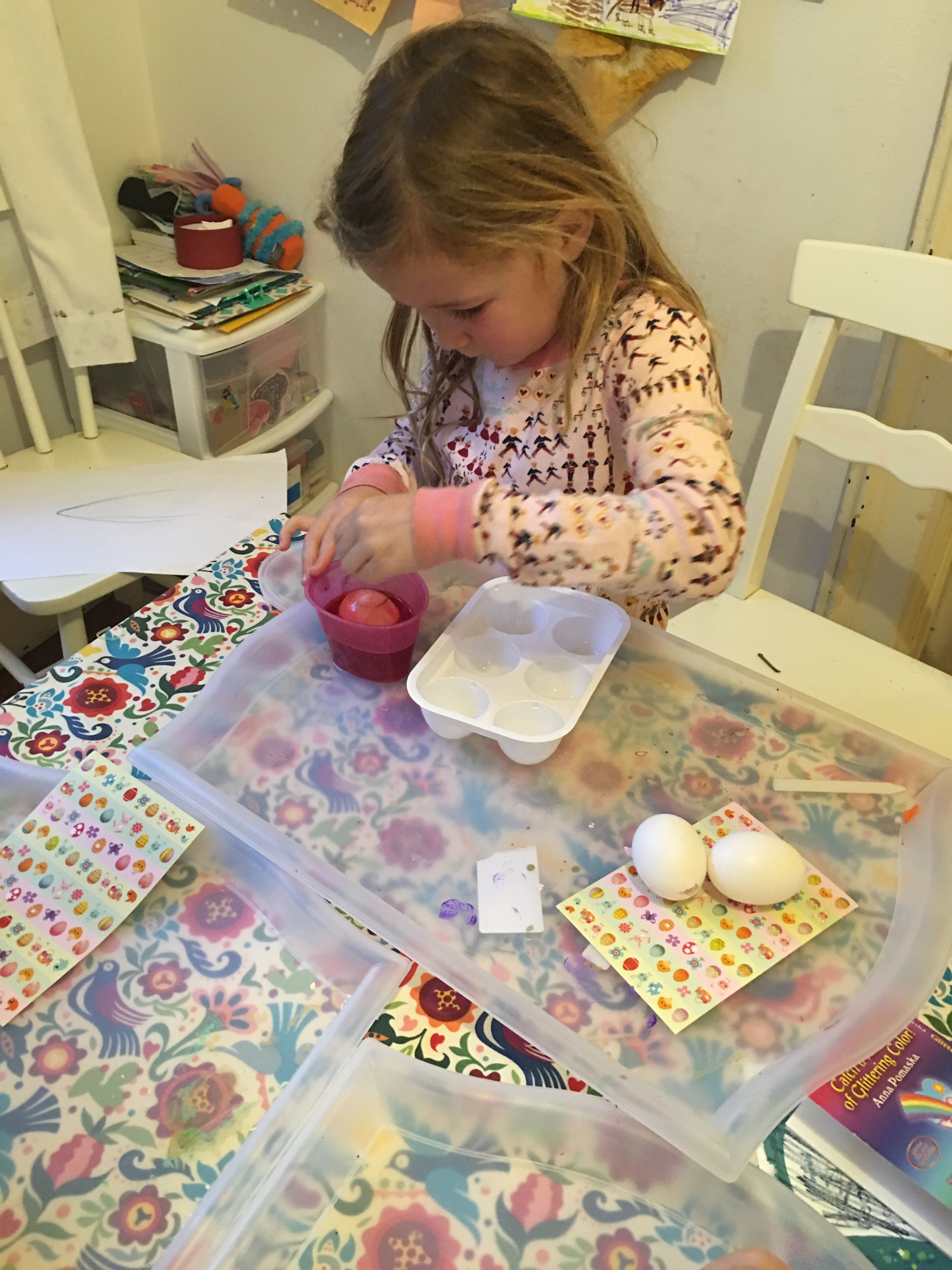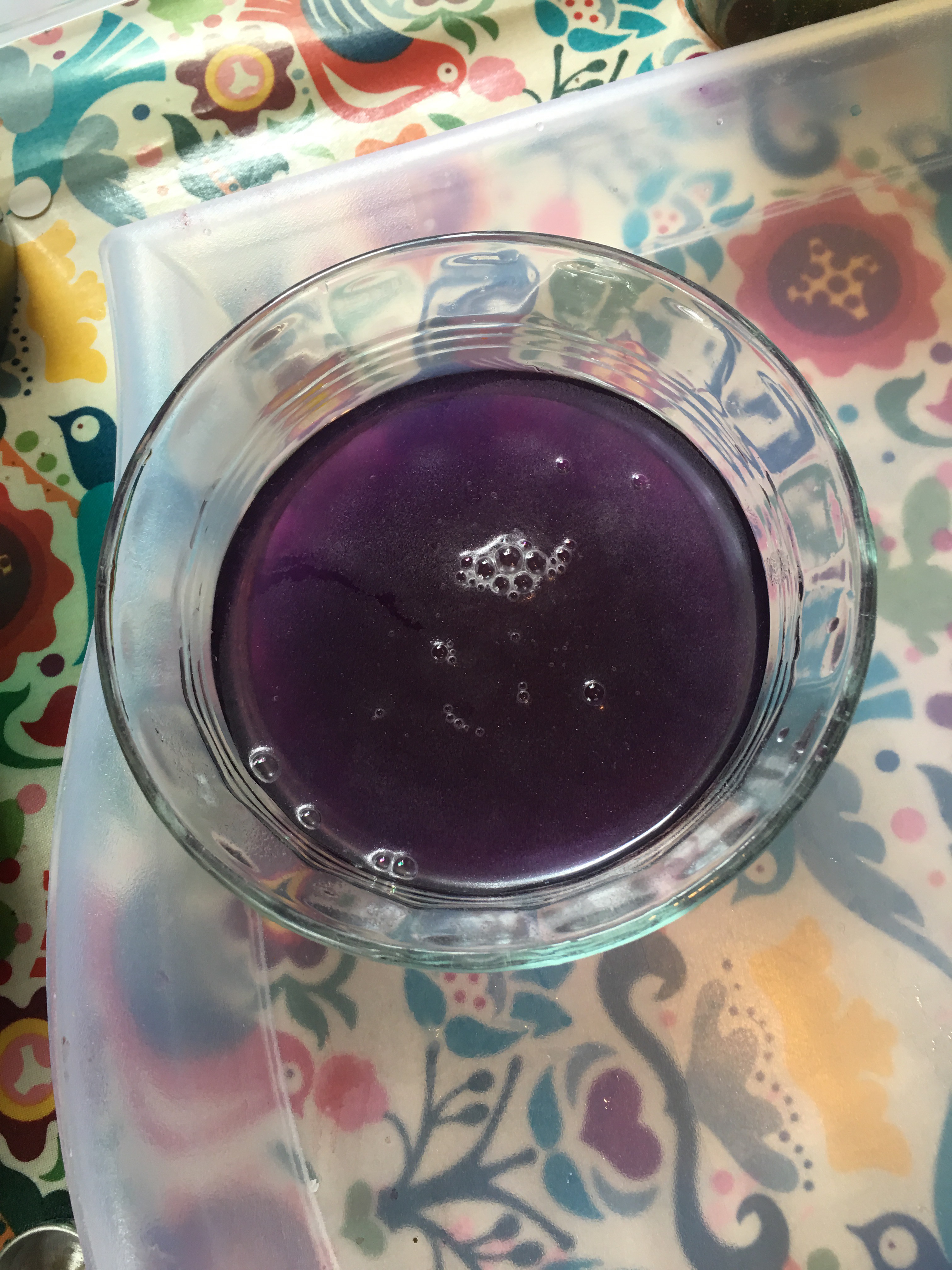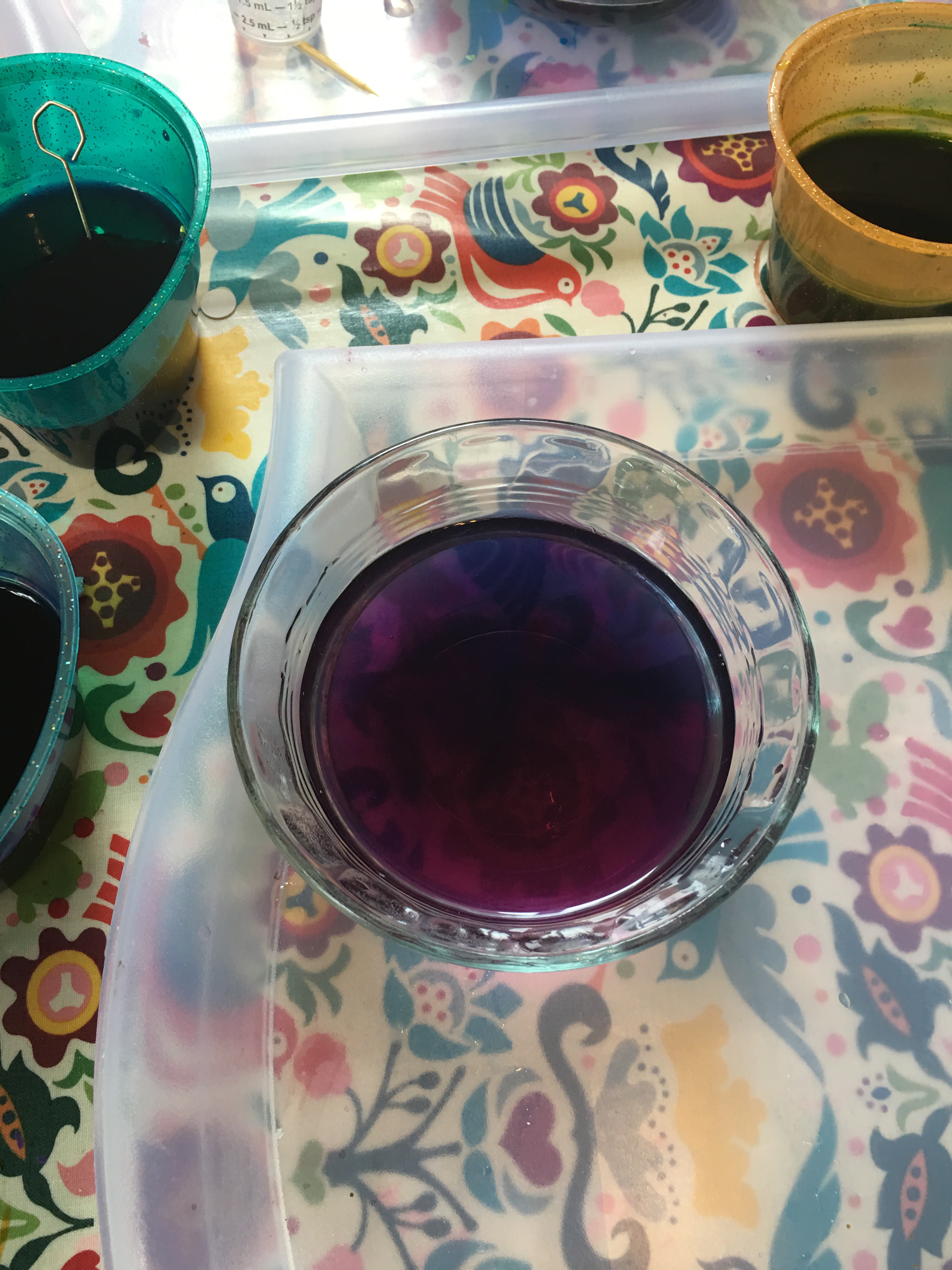 And in case you want to try magical cabbage concoction: for dye, I think my concentration of cabbage to water was off, plus I think actually boiling the eggs with the cabbage makes for the best color. But we had fun with the cabbage water! Did you know that red cabbage changes color depending on whether it is exposed to acid or alkaline solutions? So cabbage water+vinegar+baking soda= fun.