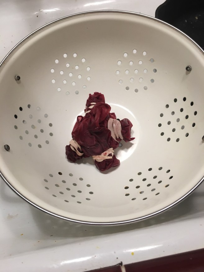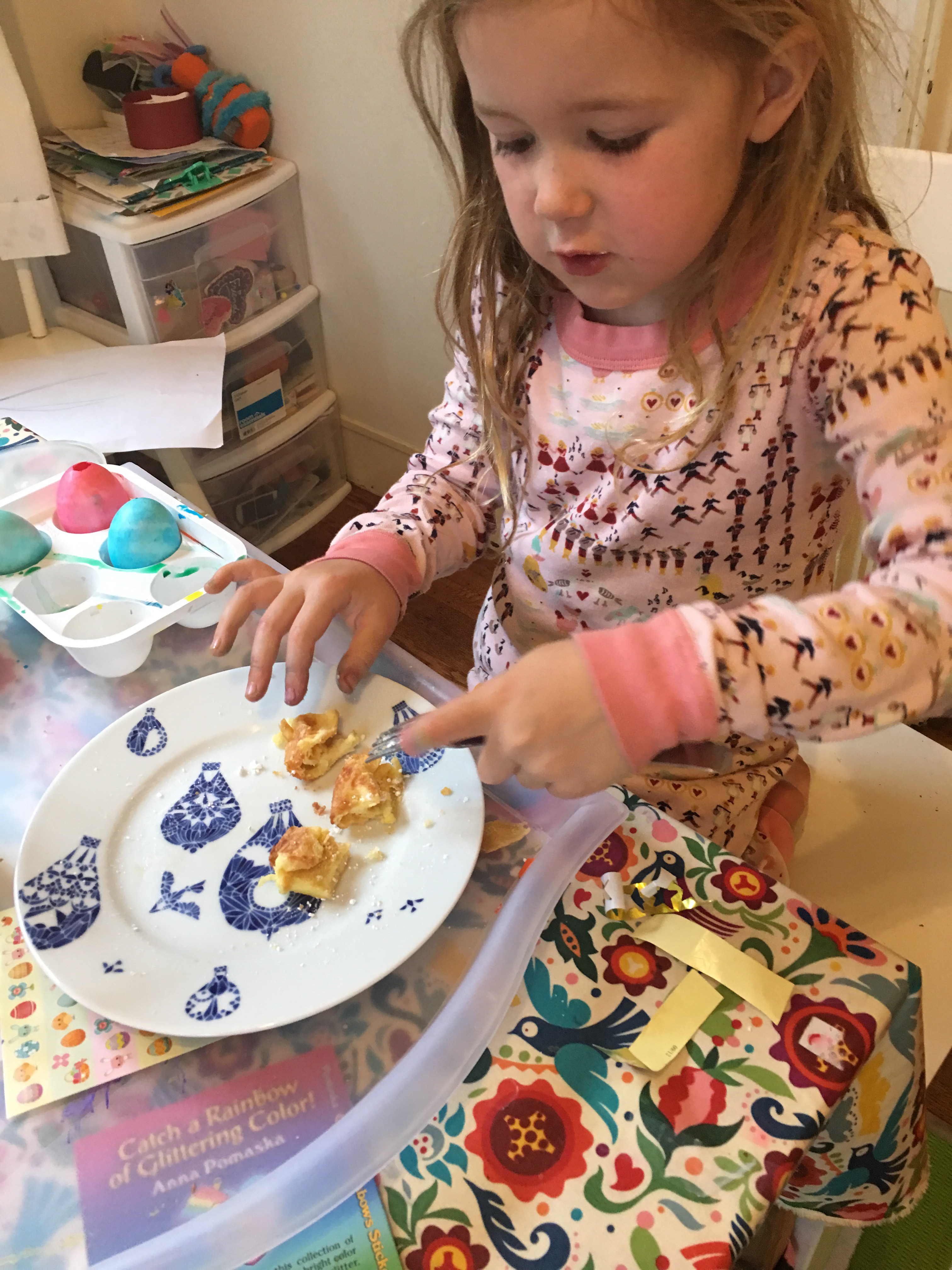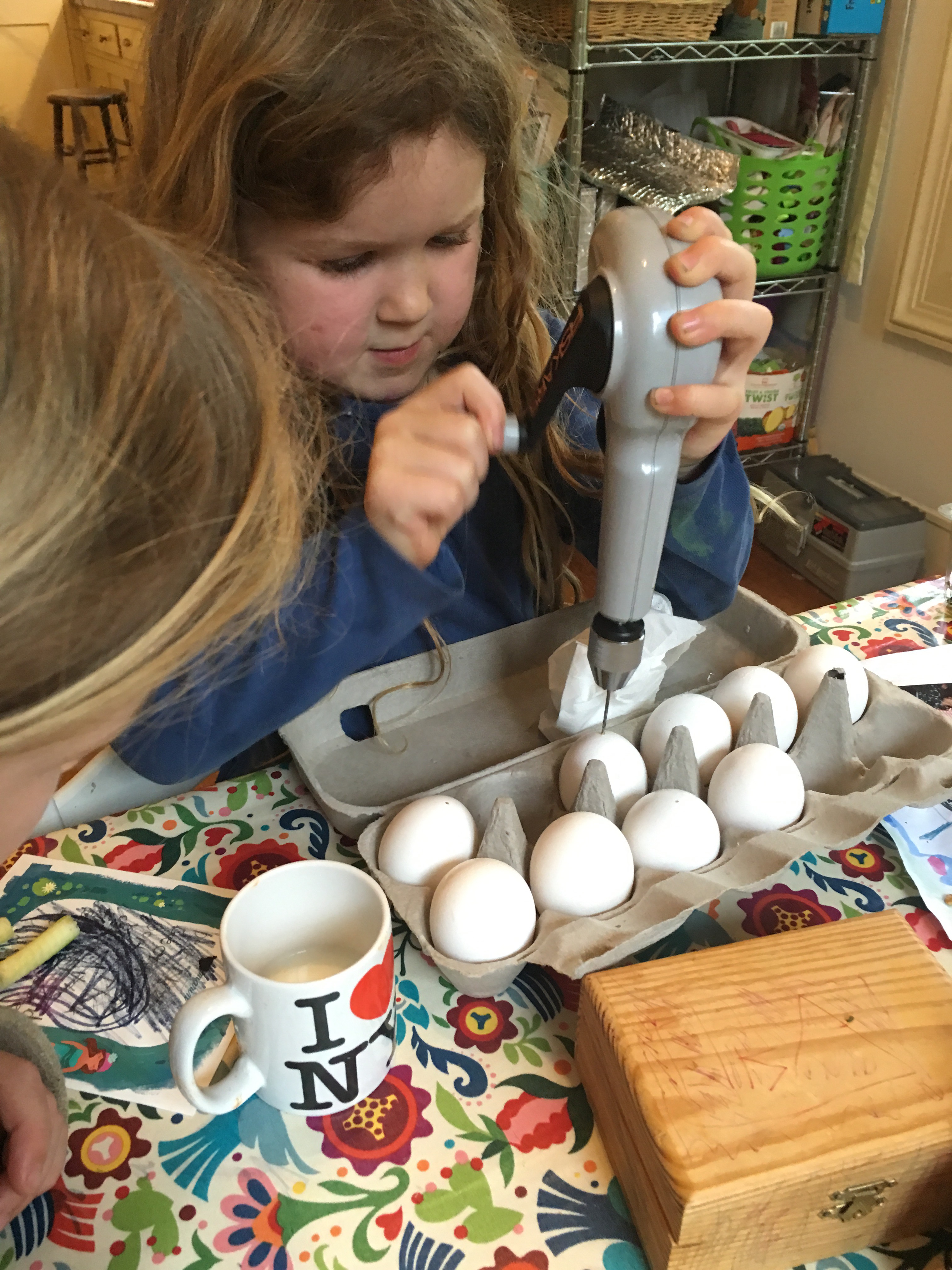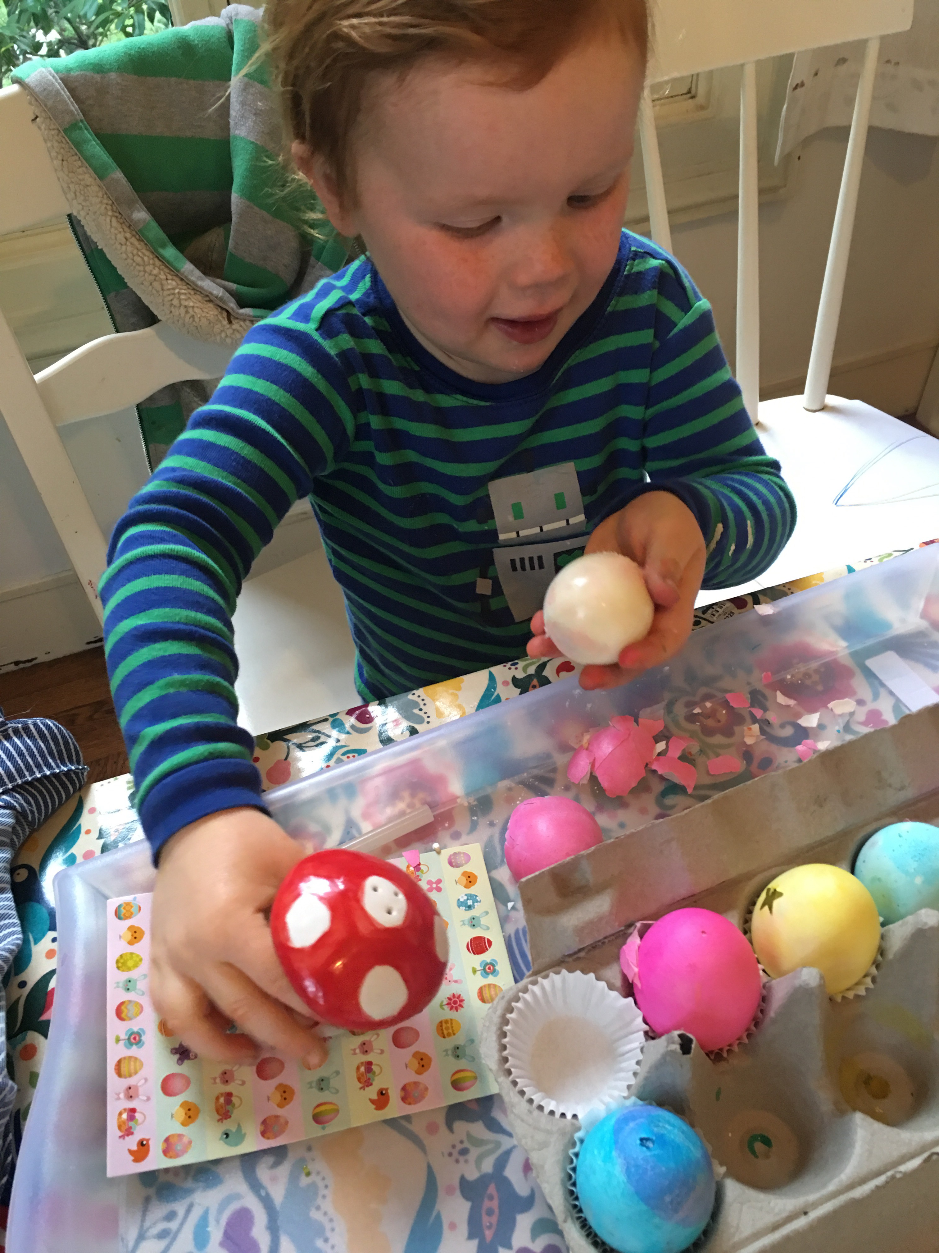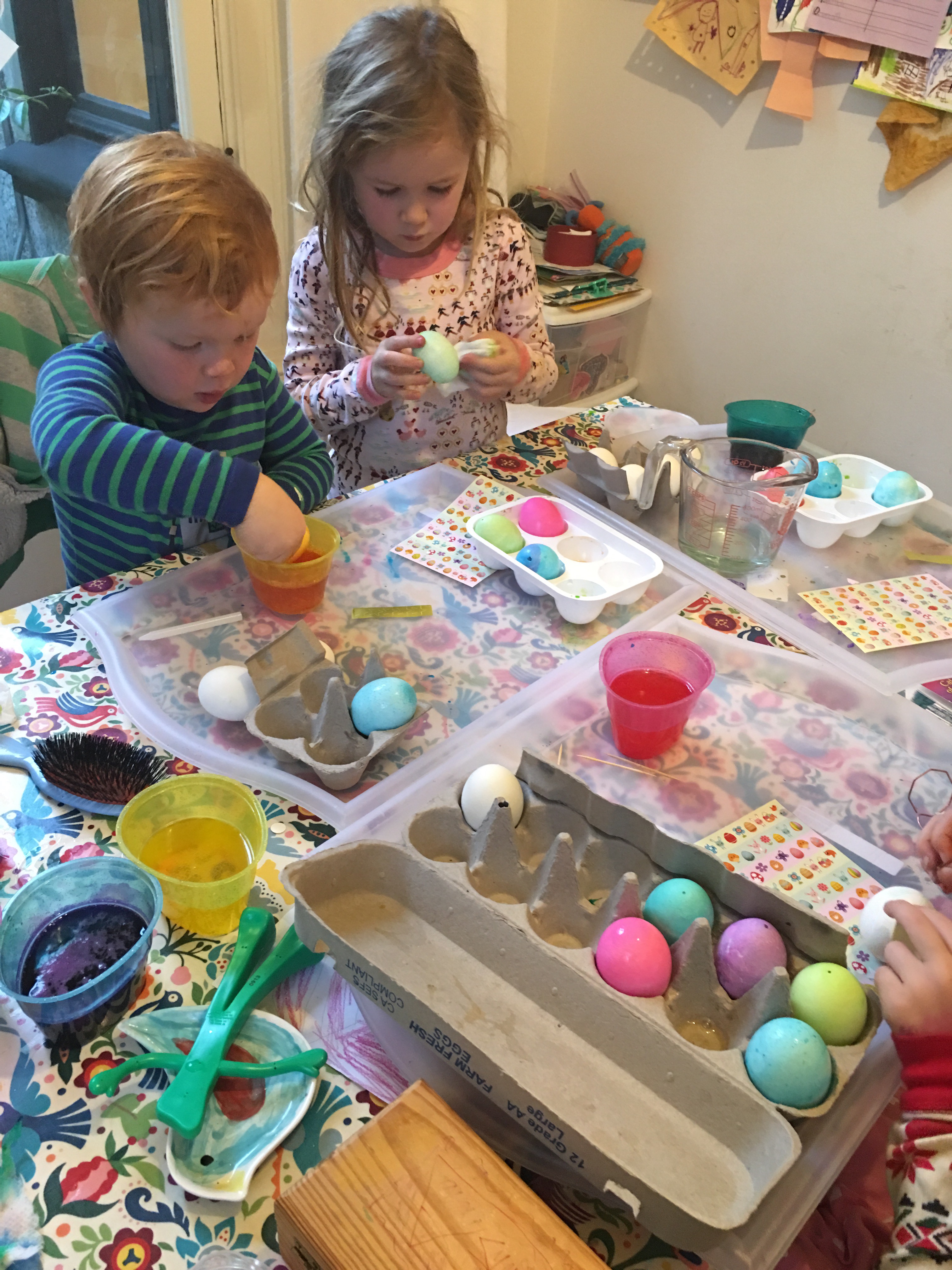 And in case you want to try magical cabbage concoction: for dye, I think my concentration of cabbage to water was off, plus I think actually boiling the eggs with the cabbage makes for the best color. But we had fun with the cabbage water! Did you know that red cabbage changes color depending on whether it is exposed to acid or alkaline solutions? So cabbage water+vinegar+baking soda= fun.