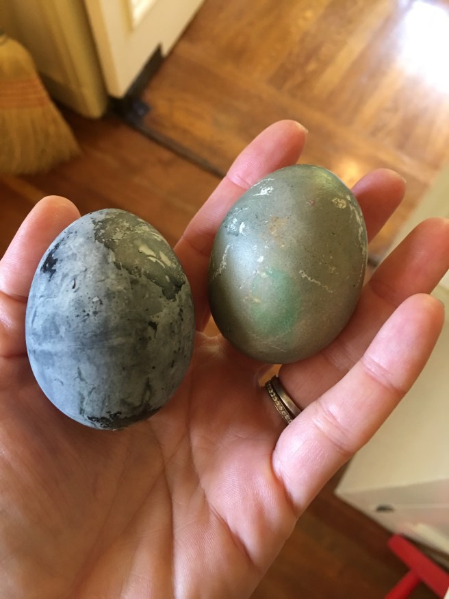 An egg soaked briefly(on the right) turned grey-green, and the one soaked over night turned marbled black!!